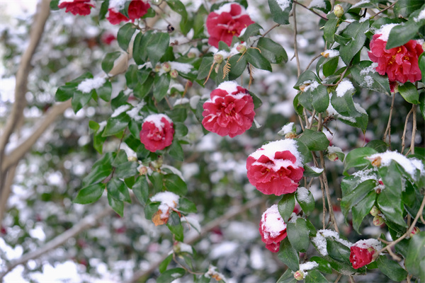 不畏严寒的茶梅,如风雪中的“俏佳人”,在雪中绽出“俏丽”春光。园内1000多株茶梅正值盛花期,它们以繁花满枝的姿态,在素色天地里泼洒出大块大块的明媚色彩,为清冷的空气注入一股鲜活的暖意。翠绿的枝叶托起松软的白雪,粉红、大红色的花朵从白雪中热烈地探出头来,红白相映,粉妆玉砌。近处花朵娇艳欲滴,远处花树影影绰绰,在积雪覆顶的树林衬托下,层次丰富,色彩对比鲜明,绘就一幅动人的“雪中点彩图”。