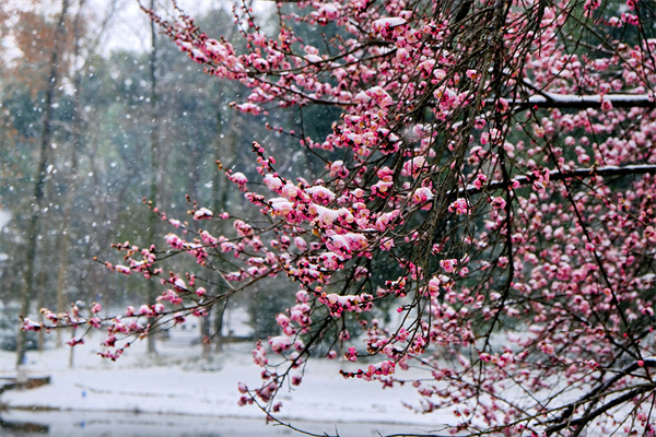 雪中赏梅,为一大雅事。在武汉植物园小梅园,怒放的朱砂梅、宫粉梅、江梅被白雪压枝,更显清绝风骨。虬劲的枝干上,积雪勾勒出遒劲的线条,而点点红梅、粉梅缀满枝头,不与雪争色,只以清雅示人。粉瓣凝晶,薄透如玉,与枝头莹雪相映成画。虬枝横斜,雪映嫣红,疏影暗香自成一景。细雪纷飞中,游客或驻足细赏,或举起手机记录这难得一见的“雪压梅枝”之美。
