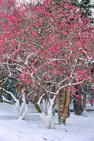 雪不仅为“三梅”增色,更将园内中式园林的意境凸显。被白雪覆盖的中式亭台,彩绘鲜艳,檐角玲珑,静立于覆雪的小丘上,倒映在静谧的水面,构成一幅经典的雪中亭台图。亭台楼阁、小桥曲径皆在匀净白雪的装点下,勾勒出古典园林特有的静谧与古朴。