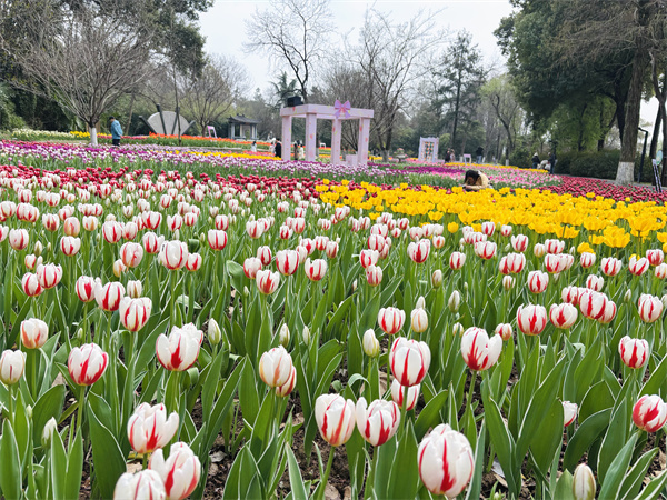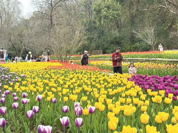 今年,武汉植物园依据地形精心布置了多个主题花海。在林畔花圃,利用阶梯地形打造的郁金香花带,宛如倾泻而下的彩色瀑布,在雨后更显流光溢彩。雨水也赋予了花园别样的层次与意境。在绿野花田,前景怒放的郁金香、中景如雪团般的木绣球与背景浓郁的绿树,在雨雾中构成一幅层次丰富、颇具油画质感的美景。漫步至林下空间,则会发现另一番趣味:那些点缀在林荫下的糖果色郁金香,挂着晶莹水珠,如同散落在森林里的宝石,静谧而美好。目前,郁金香中晚期品种已经接力开放,花瓣边缘带锯齿的流苏花型郁金香“水晶星”、拥有醒目红黄双色的“克劳斯亲王”、洋溢着少女感的粉色“拉拉队”,以及花瓣上带有跃动火焰纹的“幸福一代”等特色品种均已盛放,构成了花海中最跳跃的音符。本届郁金香花展的整体花期预计将持续至4月上旬。