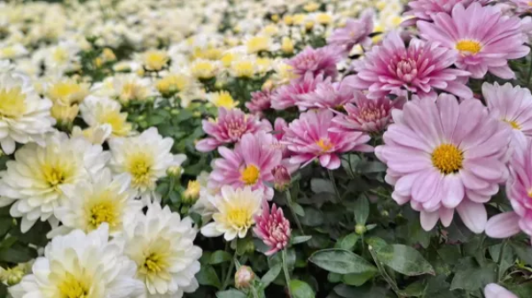 “东篱月光”和“东篱娇粉”小菊。前者为重瓣花型,最初开时花色淡黄,随着花朵逐步开放,颜色逐渐转为纯白,犹如皎洁的月光;后者则呈深粉色。