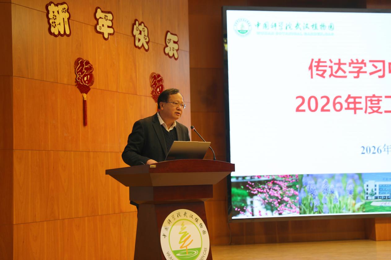 2026年2月11日,武汉植物园召开2026年度院工作会议精神传达暨2025年度总结表彰会。园领导班子成员,党委委员、纪委委员,党支部书记,研究中心负责人,中层干部,科研及管理骨干代表、离退休代表等参加会议。会议由副主任黄伟主持。
