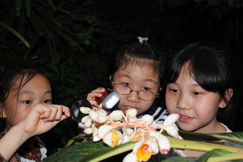 观赏完昆虫,夜间植物的生活更是吸引了会员们的注意。在电筒光线的照射下,会员们惊奇地发现了一些植物夜晚独特的一面。白天美丽绽放的睡莲和含羞草已沉沉入睡,一株多色、绚丽婀娜的紫茉莉在夜晚独自美丽绽放。紫茉莉花期很长,但是它一天只在黄昏时候盛开,次日凌晨就凋萎了,所以看到它开放的人并不多。昆虫开始了鸣奏曲,鸟类大胆地出动歌唱,夜间开放的花儿也静悄悄地孤芳自赏。这些动植物的变化都是白天所看不到的,奇趣多彩的夜游让会员们受益匪浅。