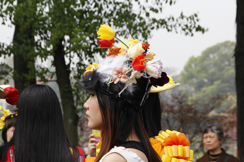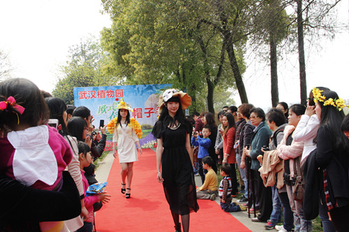 武汉纺织大学的学生们别出心裁,用蝴蝶、花朵、蕾丝、羽毛等元素加上郁金香、葡萄风信子设计了12顶不同风格的帽子。有的用绢花、蝴蝶加上郁金香点缀在宽沿的沙滩帽上,显得明艳动人;有的则用黑丝、豹纹的布艺图案将帽子打扮的别致妩媚;还有的将帽子设计成高高的发束,上面插上羽毛和郁金香,高贵迷人。动感的音乐声响起,学生模特们走起猫步,将女性服饰的美丽、郁金香的优雅展现的淋漓尽致。简约的设计,大胆的搭配,斑斓的色彩,新颖别致的帽子展出一片姹紫嫣红,在郁金香花田中显得更加艳丽,受到游客的一致称赞。