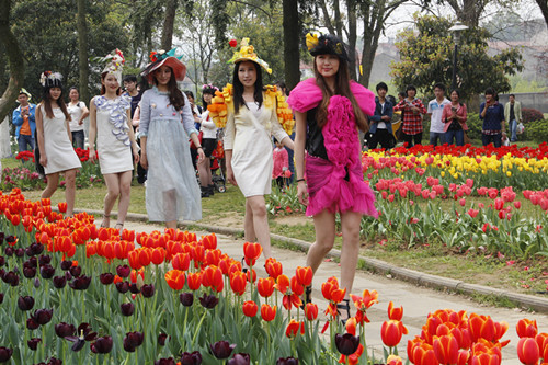 3月30日,武汉植物园上演了一场别开生面的帽子秀。来自武汉纺织大学的学生,戴着12顶含有郁金香、葡萄风信子等美丽花卉的帽子,在武汉植物园的郁金香花田中走起猫步,和郁金香一起比美。