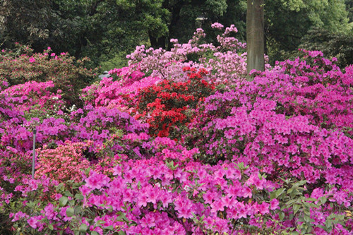 武汉植物园杜鹃花主要按照一园多线的形式来布置,杜鹃园模拟野生杜鹃生长环境,依据坡地落差分类种植高山、亚高山杜鹃。虽然杜鹃花树多数只有一米多高,但因种植在不同坡度上,形成了丰富的观赏层次。杜鹃园-药园-山茶园-猕猴桃园-三峡晓涨带沿线的道路两旁则形成了姹紫嫣红的杜鹃花带。杜鹃花色艳丽,除红色、紫色、粉色、白色等单色外,还有多种复色杜鹃花。记者看到,因为不少杜鹃种植在该园小径的两旁,红艳艳的一片、灿若云霞,依托着绿树幽林,和清幽的环境相映成趣,十分相得益彰。