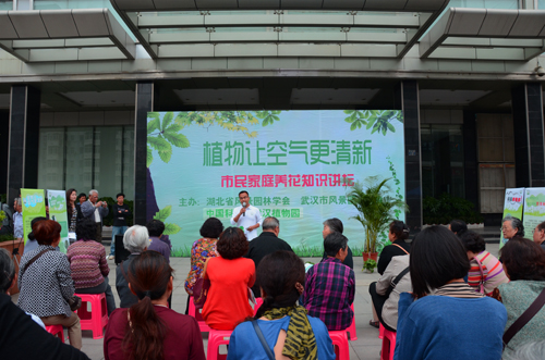 5月11日,武汉植物园继在沙湖公园、首义广场“进社区”科普活动之后,再度携手湖北省、市风景园林学会在中南路建设厅广场前开展了主题为“植物让空气更清新”的科普活动,活动由四个环节组成:科普讲座、现场互动、专家咨询和发放花卉。