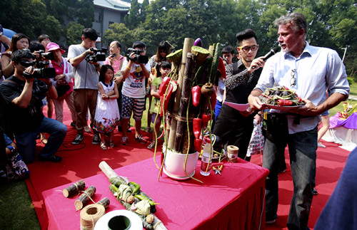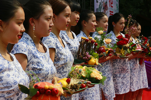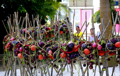 无论是喜庆的大红绸子和苹果做的迎宾门,用竹子做骨架、水果为龙身的竹龙,还是洋溢着荷叶清香的荷叶边花篮,整个果蔬花艺展充满丰富的中国元素。花艺展看起来既有欧洲花艺的时尚小清新,又带着强烈的中国花艺视觉符号,中国风十足。