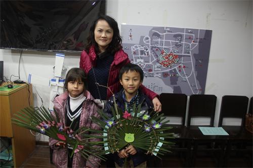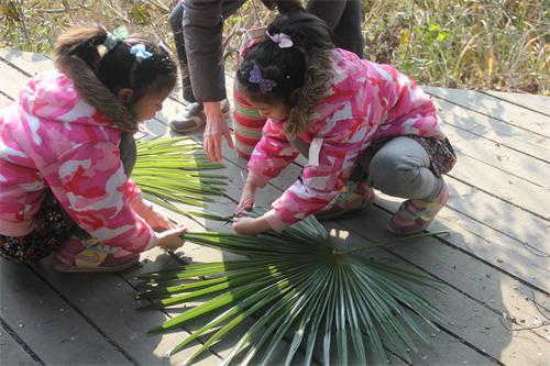 户外,孩子们在湖边看到了大片的棕榈及芦苇,观察了这两种植物的生长环境,了解了它们的生长过程,孩子们小心翼翼的采摘到植物叶片,带回教室制作植物编织品。在教室,亲子家庭的父母和孩子交流如何制作编织品,孩子们掌握了基本的编织方法,和家长一起动手做起编织。成果展示环节,孩子们向大家介绍自己的编织制作经验。每个家庭都与自己的制作的编织品合影留恋,孩子们和家长一起分享了成功的快乐!