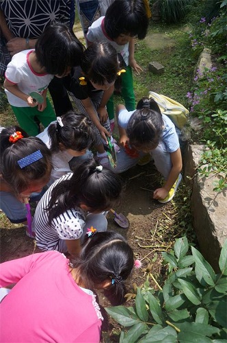 户外观察环节,孩子们分为4组,在园区内寻找适宜蚯蚓生存的土壤环境,并观察蚯蚓的生活状态。该环节中,孩子们不仅完成了对蚯蚓的多角度观察,而且对观察结果做了详实的记录。