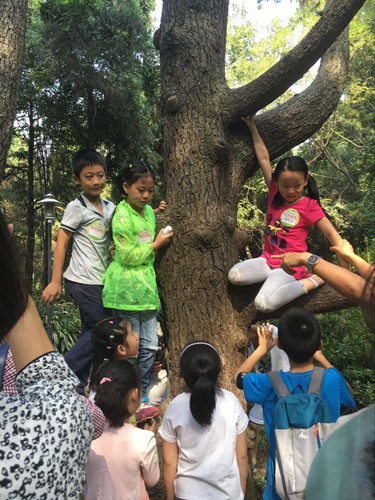 武汉植物园针叶林是一片自然生长的区域,保留了针叶林的原始风貌。林中,以马尾松为代表的高大乔木遮天蔽日,千姿百态的灌木枝繁叶茂,各种荫生植物、蕨类植物、草本植物郁郁葱葱,令人目不暇接。如何才能让小朋友在有限的时间对森林有直观的感受?教育家康·德·乌申斯基曾写道“儿童普遍用形式、声音、色彩和感觉进行思维”,因此课堂充分调动小朋友的视觉、触觉、味觉进行认知,加深他们对森林的理解,帮助形成积极的情绪记忆。左右手分别摸一摸枳椇和朴树的叶子,一个柔软似纸,一个却革质粗糙,很多小朋友感慨“原来看上去差不多的叶子还可以用触摸来分别呢,以后我摸一摸就知道是不是朴树了”。闻味道的时候,小朋友的反应最是有趣:雪松、马尾松的松香味,樟树特有的香味令人对叶片爱不释手;而闻到山胡椒叶子的“胡椒味”、竹叶花椒叶子的“花椒味”时,有的小朋友激动异常,有的一脸嫌弃,有的恍然大悟。此外,小朋友们还认识了浑身长着尖刺的椤木石楠,会攀爬的薜荔等有趣植物。