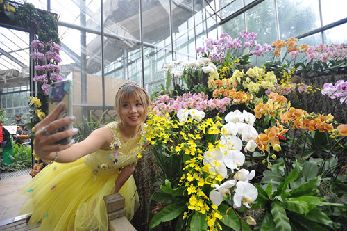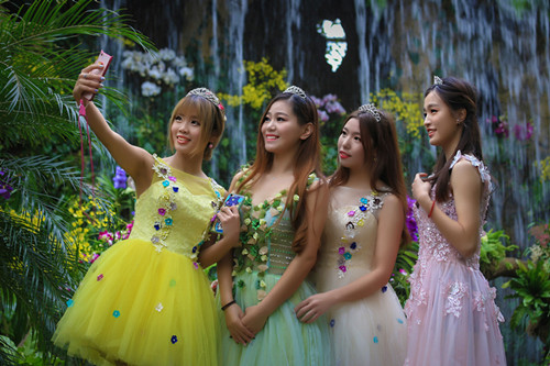 雨林室瀑布前的兰花仙子们 摄影:汉网 popai