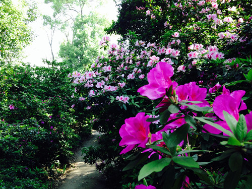 武汉植物园杜鹃花主要按照一园多线的形式来布置,杜鹃园模拟野生杜鹃生长环境,依据坡地落差分类种植高山、亚高山杜鹃。虽然杜鹃花树多数只有一米多高,但因种植在不同坡度上,形成了丰富的观赏层次。杜鹃园-药园-山茶园-猕猴桃园-三峡晓涨带沿线的道路两旁则形成了姹紫嫣红的杜鹃花带。因为不少杜鹃种植在该园小径的两旁,红艳艳的一片、灿若云霞,依托着绿树幽林,和清幽的环境相映成趣。武汉植物园杜鹃花展将持续到五一。
