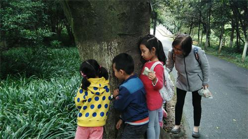 首先,绘本阅读环节,李老师绘声绘色的讲述了 “声音怎么来的”故事,通过故事,孩子们了解到声音的来源和人类为什么能听到声音的知识。李老师和孩子们分享了蝉、蜜蜂、蝈蝈它们发声的原因及其声音的来源。接着,静听自然环节,孩子们在李老师的引领下走进自然,静听“大树的心跳”,孩子们惊奇地发现,长时间安静的倾听,真的可以听见树干里汁液流动的声音,好似大树在喝水。接下来的兴趣探究环节,孩子们探究了秋天树叶颜色的变化及园区果实成熟落下的声音,他们自由寻找自己感兴趣的观察对象进行细致观察,根据所看到的现象不断辨析,积极思考,主动判断现象背后的成因。最后,漫步园区环节孩子们与家长一起静听了鸟叫声、流水声、微风声、小雨声、昆虫声,孩子们将所见所闻与家长开心分享。