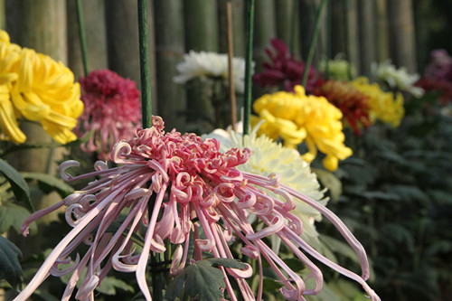 作为华中地区菊花资源收集保育和研究中心,品种丰富是武汉植物园菊花展最大的亮点。本届菊展展示的菊花品种逾千种,涵盖了菊花的5个瓣型、30个花型以及8个色系。“墨荷”、“帅旗”等十大传统名菊,“古刹金刚”“金背大红”“黄埔锦绣”等历届全国菊展获奖品种继续精彩亮相,还有花瓣带着毛刺的“白毛刺”,如花瓣尖端如龙爪般张开的“盘龙金爪”,形态如凤凰展翅的“凤凰振羽”,众多菊花名品争奇斗艳。从色系上来讲,有红、粉、黄、白、绿、墨、复色、间色等色系,红色的“朱砂红霜”、粉色的“粉面金刚”、绿色的“绿牡丹”、墨色的“墨王”,一花双色的“鸳鸯”,将秋色晕染的五彩斑斓。展览汇聚了全国各地的菊花精品,来自武汉本土的“盘龙春晓”、天津的“沽水红霞”、古城开封的“汴梁绿翠”等多地菊花同台比美。另外菊展还展示了国华系列、泉乡系列等日本品种名菊。这些菊花以万千变化的姿态、绚丽夺目的色彩、高雅圣洁的风骨,展现丰富璀璨的菊花大观。