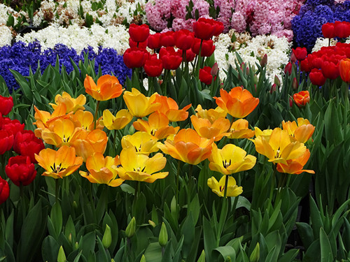 花展分为四个展区。主展区菊花圃,以“荷兰人的后花园”为主题,利用球根花卉缤纷的“色彩库”、丰富的植物材料和多样的植物配置手段,力图呈现草木繁盛、繁花似锦、层次丰富的花园景观。该展区大量利用各色郁金香打造色带、色块,还通过不同色彩不同花型不同高度的郁金香混播打造混合花田,营造新鲜丰富的视觉感受。首次通过花境的形式,以郁金香为主角,配植番红花、矢车菊、花毛梗、瓜叶菊等植物,打造立体多面、色彩丰富的植物群落景观,营造更加自然、生态的观赏氛围,展示球根花卉在园林景观中的应用。主展区烧烤区展区,以粉色系的郁金香为基础色,搭配白色、粉紫、淡蓝等同色调的其它色彩的球根花卉,怒放的郁金香与与高大的乔木、青翠的草地交相辉映,打造一个清新浪漫的赏花区域。莲轩展区依山傍水,园艺师用葡萄风信子织成紫色溪流,用各色郁金香镶边,风起时,花随着风动,景观化成流动花溪。园艺师同时依据蜿蜒的地形将10多种不同颜色的郁金香顺地势种植,形成流畅的花海色带。花影入水,花水相依,更加灵动。在密林展区,选取色彩明亮的郁金香根据对比色种植,呈现“中有杂树、芳草鲜美、落英缤纷”的观感。