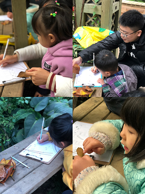 出发前,袁老师像大家提问“树叶掉下来的时候哪面朝下?”通过户外观察,孩子们发现是正面朝下,追着老师问原因,激发了孩子们的探索精神。接着,带上任务单,寻找不同形态的叶子,大家专注的观察每种叶子的特征,绘画并做记录。