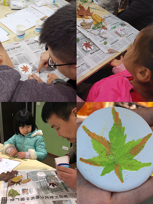 随后,回到室内进行趣味手工环节,大家带上捡回来的树叶,用石膏和画笔动手制作了精美的树叶拓印,把美丽的树叶定格在了小小的石膏模板上,树叶的美在于叶脉的精致,小小的叶片上面有着成千上万的脉络,通过植物拓印的方法,孩子们留下了它们独特的纹理和色彩。