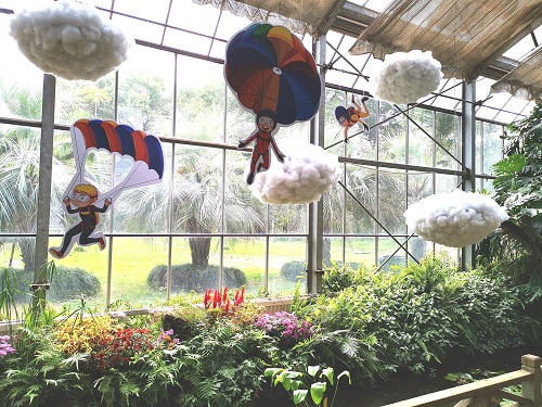 热带雨林室水池一侧打造的是跳伞项目的场景,白色的棉花象征云朵,跳伞的军人在鲜花簇拥中一跃而下,展示勇于挑战的体育精神。