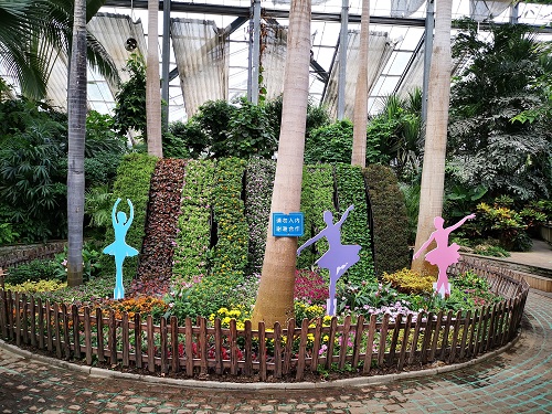展览的主场区在景观温室。在景观温室的中央,园艺师用马蹄莲、小菊花、鸡冠花、姜荷花等10多种花材做出花瀑布等图案。各种造型的人物在花池中间翩跹起舞,表现了全国人民喜迎军运会这一盛大活动赛事的祥和场景。