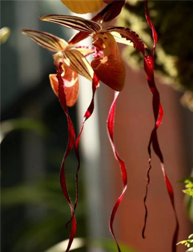 外形奇特飘逸的飘带兜兰让人惊艳,飘带兜兰唇瓣似拖鞋,两个花瓣能长到10多厘米,下垂且卷曲,如飘带状,在花丛中显得独树一帜。
