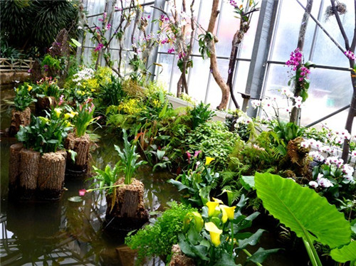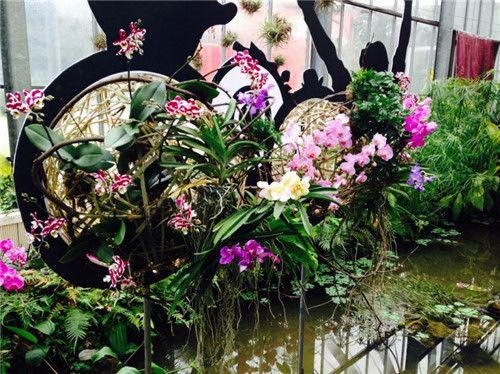 为了还原热带兰花的生长状态,园艺师采用原生态的布展手法,热带兰花或依附枯木、或缠绕青石、或悬挂空中,或林立在瀑布前,满眼苍翠的热带植物搭配色彩绚丽的景观,形成一片生机勃勃、绿意盎然的热带森林景致。