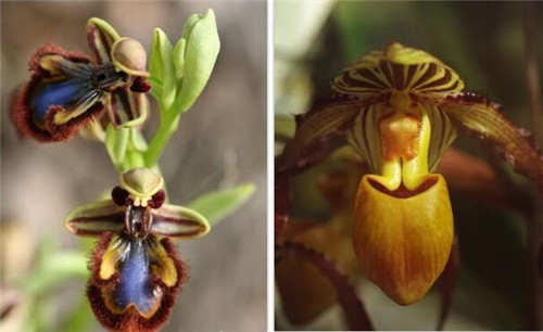 ‘杏黄兜兰(右)’与‘硬叶兜兰’(左)