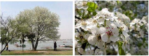 左图:盛花期的豆梨 右图:豆梨红色的花药