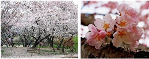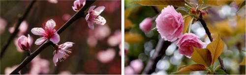 左图:总是成对出现、没有花梗的桃花 右图:樱花有花梗