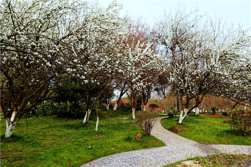 与桃樱海棠的明媚鲜妍不同,这种玉白的清新颜色,给人更加诗意的感觉。群植的梨花呈现出“千树万树梨花开”的景象,让人浮想联翩,回味无穷。李花则把古色古香的建筑衬托得更加古朴典雅。
