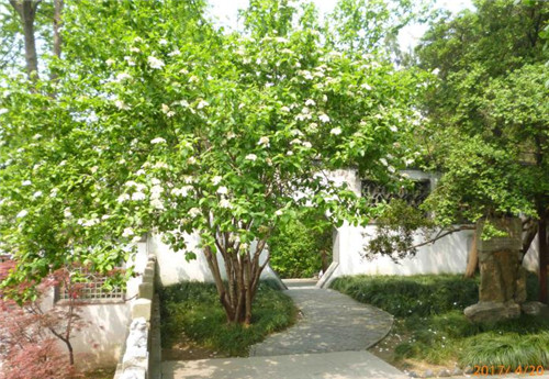 琼花也可植于坡地、水边、建筑旁及与园林小品相结合。如扬州琼花观、大月寺等地的琼花景色,或与水相映成趣,或与塔遥遥相望,大家不仅可以赏美景,还能听趣闻,绝对让人回味无穷、流连忘返。
