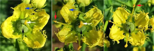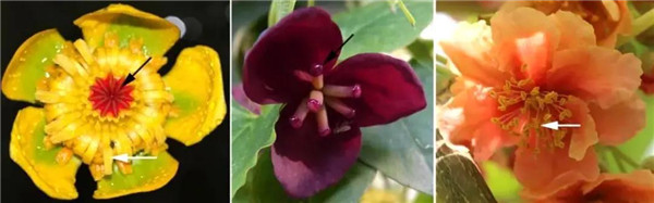 图1 从左到右,依次为中华萍蓬草Nuphar sinensis(两性花),三叶木通(原亚种)Akebia trifoliatasubsp.Trifoliata(雌花),毛花猕猴桃Actinidia eriantha(雄花)(黑色箭头为柱头,白色箭头为花药,下同)