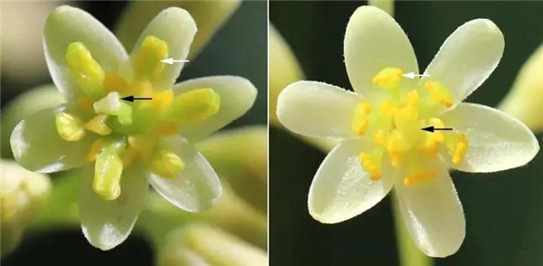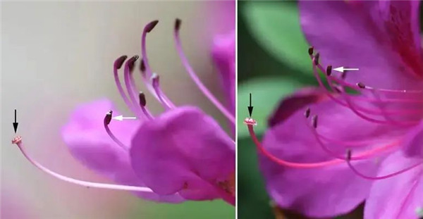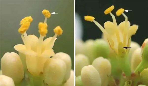 图2 雄性先熟。左图为雄性阶段,花药正散粉,柱头还未有活性;右图为雌性阶段,柱头正有活性(柱头上有黏液),花药散粉完毕