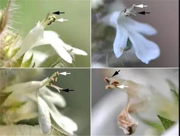 近期报道了在唇形科金疮小草中这种动态式运动方式,在开花过程中雄蕊和柱头会相互朝着对方运动而达到互换位置的效果,并且伴随着雌雄异熟(图10)。