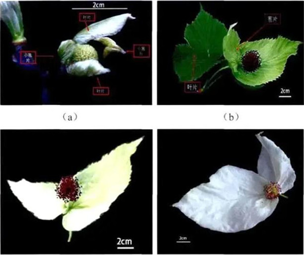 在发育过程中,珙桐苞片的形态结构与叶片存在一定差异,苞片发育最初阶段与普通叶片形态差异小,色差小,之后逐渐与叶片颜色出现明显差异,叶绿素含量逐渐降低,表现为逐渐变为浅绿色,最后成为白色。