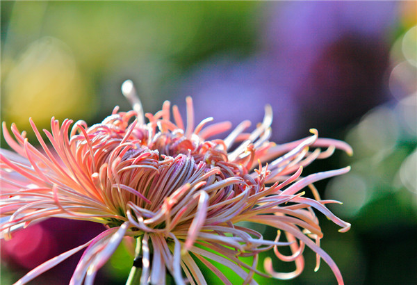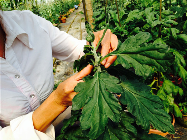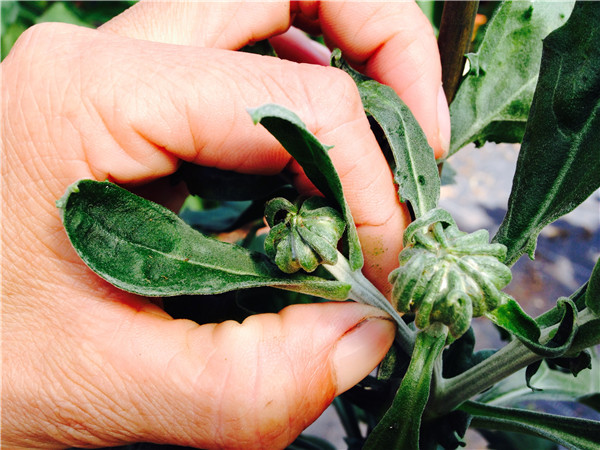 到菊花生长后期出现侧芽时需进行剥芽。现蕾后,当枝顶端主蕾与其下的副蕾或侧蕾呈拥挤而散开时进行除蕾。除蕾时须留枝顶端的一个主蕾与其下的一个副蕾备用,其余花蕾分次剥除。剥芽除蕾工作需及时进行,以免消耗养分。
