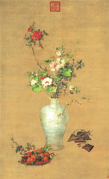 这是一幅近似于欧洲静物画的作品,青瓷瓶内插着蒲草叶、石榴花、蜀葵花,托盘里盛有李子和樱桃,几个粽子散落一旁。