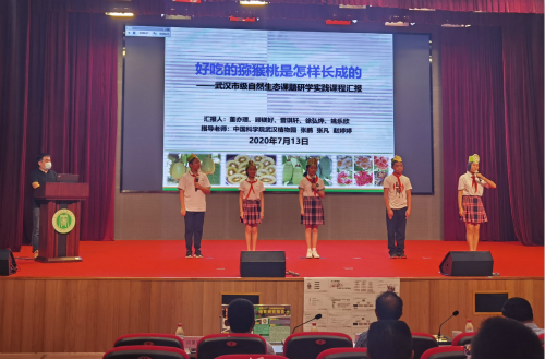 7月13日,武汉市2019年中小学自然生态课题研学结题仪式在常青一中举行。来自武汉市13个中小学的学生代表依次上台进行成果汇报答辩。由武汉植物园负责的《好吃的猕猴桃是怎样长成的》研究课题在13个课题中脱颖而出,荣获2019年武汉市自然生态课题研学一等奖。