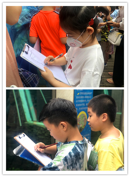 “老师,沉水植物吐了好多泡泡。”“老师,我看见狐尾藻中间的孔了,但是吹不出气来。”“老师,水葫芦的气囊可以听见声音。”“老师,我看见王莲了,我可以试试坐上去吗?”“老师,荷叶叶柄的气孔好大呀,可以当万花筒。”户外探究环节,曹老师带领孩子们在沉水植物展示区、荷花睡莲展示区进行植物的打捞、观察、探究和记录。主讲老师和助教老师充分调动孩子们的五感,让其化身为“小小植物勇士”,通过感官体验,对水生植物“四大家族”在水中的生存方法一探究竟。在老师们的引导下,孩子们纷纷分享了自己的观察结果并提出了心中的疑问,现场热闹非凡。户外探究的最后,在荷花展示区的木质平台处,孩子们拿着老师采摘分发的荷叶柄,在吹泡泡的游戏中,深度体验了水生植物为了适应水中生存环境,练就的发达的通气组织。