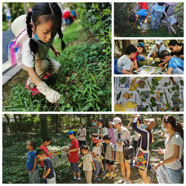 在户外,两位老师带领小朋友们沿路探寻并收集各种叶片,大家一路都有惊喜的发现:“哇,我找到心形的叶子啦”,“这个叶子是紫色的三角形,真漂亮啊”,“竟然还有像羊蹄的叶子”老师还带领大家认识了国家二级保护植物马褂木形似马褂的叶片…… 孩子们在探寻叶子的过程中,一路热情兴奋,情绪高昂。