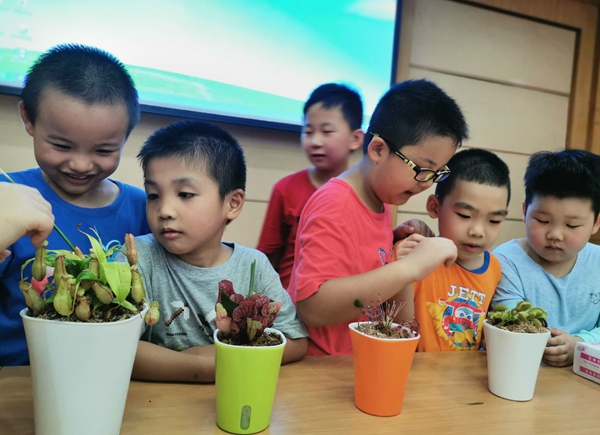 此外,两位老师还引导小朋友们现场认识了“叶子王国”尤为特殊的成员——食虫植物的叶子,孩子们惊喜的观察探索着猪笼草、捕蝇草、瓶子草等会捕食的神奇叶片,并了解了背后植物适应环境的原理。