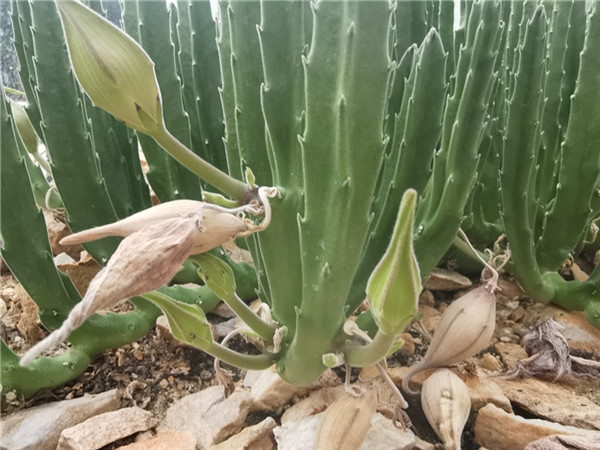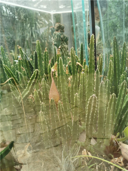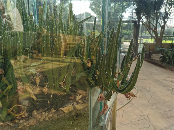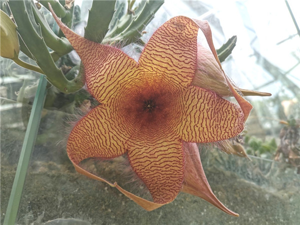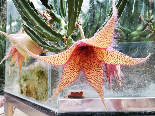 武汉植物园景观温室里的多肉多浆室一共栽种了十几株大花犀角,目前开放了一半。它们被种植在多肉多浆室的玻璃景观箱内。