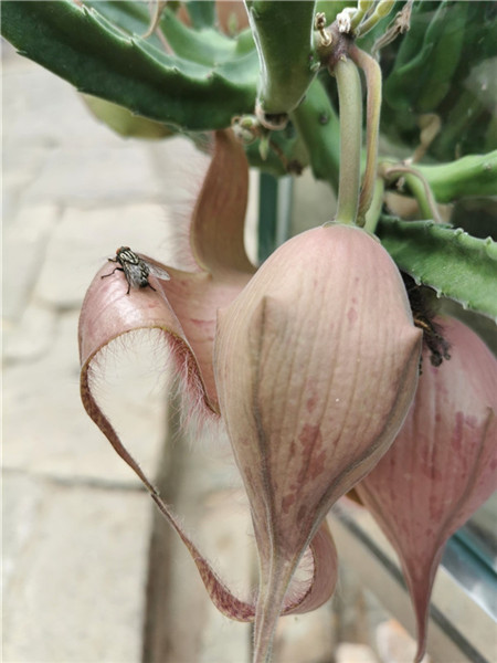 散发着臭味的大花犀角吸引“臭味相投”的苍蝇们前来帮忙授粉。在其它开花植物大多追求美且香的潮流中,它反其道而行之,也不失为一种独辟蹊径的繁殖策略。