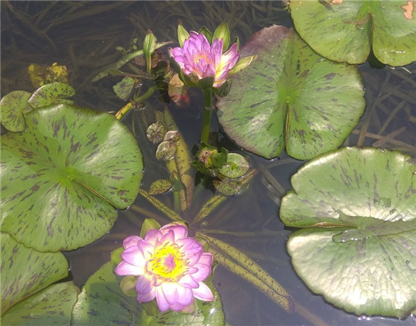 夏季,睡莲花开,清新的白、热情的红、活泼的黄、神秘的紫……各色睡莲花儿静卧于一池碧水中,宛如冰肌脱俗的少女,在骄阳下熠熠生辉,散发着独特迷人的气质。