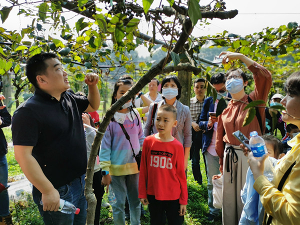 国家猕猴桃种质资源圃是世界最大的猕猴桃基因库,资源圃共收集保存猕猴桃科猕猴桃属植物66个种和变种(变型)的1200余份资源,其中包含一百余个猕猴桃品种(系)。秋高气爽,正是部分猕猴桃成熟的季节。走进国家猕猴桃种质资源圃,簇拥枝头的猕猴桃给人一种丰收的喜悦。张鹏带领医护人员观赏了几种少见又奇特的猕猴桃。小小圆圆的,像一个个小毛球一样挂在枝头,这难道也是猕猴桃?“这个是毛花猕猴桃,它的花、叶、果都覆盖有一层白色的绒毛,而且维生素C含量特别高。”张鹏介绍到。“猕猴桃不都是椭圆形的,大家来看这个京梨猕猴桃。”京梨果实为长条形,穿着带斑点的迷彩衣,显得非常特立独行。“哇,是苦涩的!”在尝到一种橙色的猕猴桃果肉之后,医护人员家庭的小朋友们连连叫到。原来这种猕猴桃叫大籽猕猴桃,以麻辣苦涩的味道成为猕猴桃中的“异类”,在成熟前是麻辣味的,成熟后果实变为橙色并会产生苦涩的味道。“虽然大籽猕猴桃不太好吃,但是它具有一定的观赏价值,而且有人喜欢它的麻辣味,以后也说不定能成为一种调味料。”各种“非典型”的猕猴桃简直打开了新世界大门,让医护人员家庭非常兴奋。“有些野生的猕猴桃并不好吃,但是每一种猕猴桃资源都很重要,作为战略植物资源,他们为科学家育种或者开发其他用途提供了基础。”