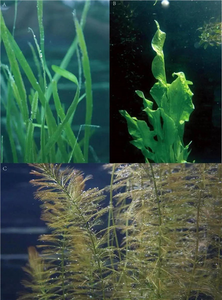 图2 沉水植物的叶片形态:(A)苦草,(B)龙舌草,(C)穗状狐尾藻(付文龙拍摄)