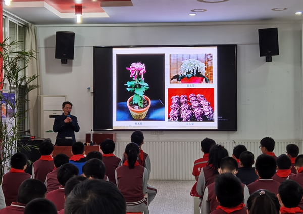 菊花原产我国,是我国十大名花之一,有着3000多年的文献记载历史,至今已经发展成为世界上品种最为丰富的栽培植物之一,菊花如此之多的品种和变异类型成为现代花卉育种的一大奇迹。本次研学课程,有着多年菊花培育经验的张永宽老师从菊花文化引入,带领同学们认识中国传统名花菊花,了解菊花的种质资源现状,认识菊花丰富的栽培类型和展出形式,并现场带领小朋友观察菊花丰富的瓣型,学习鉴赏菊花之美。活动伊始,孩子们就早早地来到课程体验中心,翘首以盼。在讲解的过程中,张永宽和张凡还通过提问抢答的方式进行互动,孩子们参与的积极性可高了,学习氛围活跃热烈,趣味盎然。