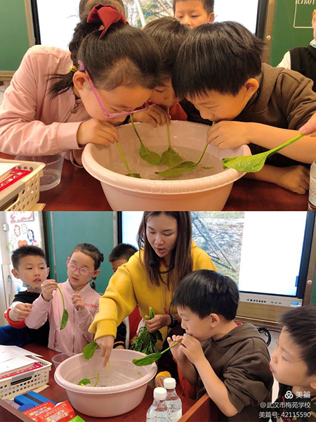 课程由室内讲解、户外探究、互动游戏三个方面组成。室内讲解环节中,袁老师生动地向学生们展示不同“茎”的类型,随后让同学们体验利用菠菜、空心菜的“茎”在水中“吐”出泡泡的互动活动,生动形象地了解“茎”通气作用,孩子们兴趣盎然,课堂气氛拉倒了高潮!