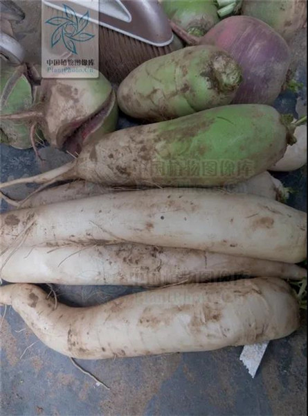 其直根肉质,长圆形、球形或圆锥形,外皮绿色、白色或红色;茎有分枝,无毛,稍具粉霜;花白色或粉红色,花瓣有紫纹;花期4-5月,果期5-6月。