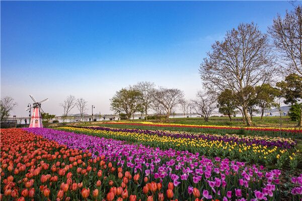 风车转动,各色郁金香形成的彩虹花带随风摇曳,是荷兰郁金香花田的经典景观。在武汉植物园湖岸带展区,五彩郁金香花田正在织就鲜花地毯,目之所及,浓郁的色彩和壮观的花田迎面袭来,色彩流淌如流动的盛宴,让人享受色彩和艺术的双重美感。在这块湖岸带的平地上,园艺师用‘皇家5号’‘火焰王子’‘玫瑰小姐’等15个品种的郁金香进行条带种植,红粉橙紫等色彩艳丽花朵较大的品种,通过重复排列种植,形成17条色带。如今,花田的郁金香全部盛放,从空中俯瞰犹如一片片彩色的条纹,美得令人目眩神迷。春风拂过,绚丽的花带摇曳生姿,一旁粉色的风车缓缓转动,美如画卷,在这里拍照,非常出片。